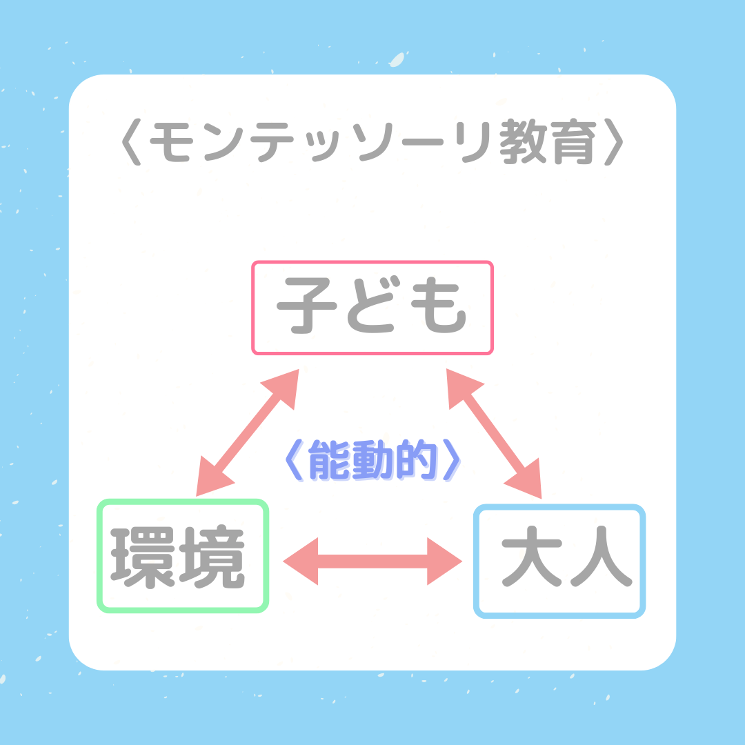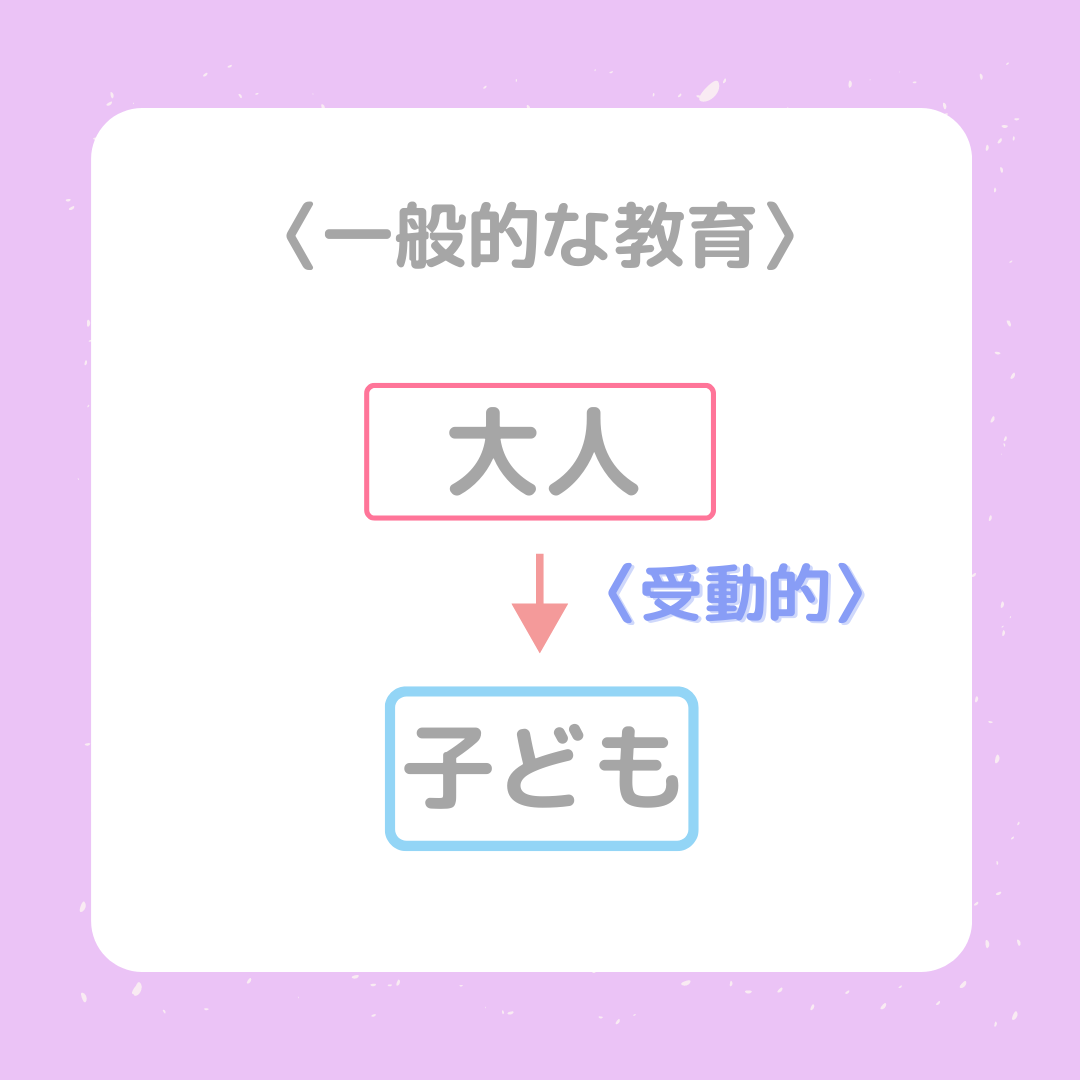 *一般的な教育は、 大人から子どもへ受動的に行われる 例)先生が提示した活動をみんなで一緒に行う 一斉保育や幼児教室では先生が前に立って、子どもたちは横並びのパターンが多いです☆彡 対して