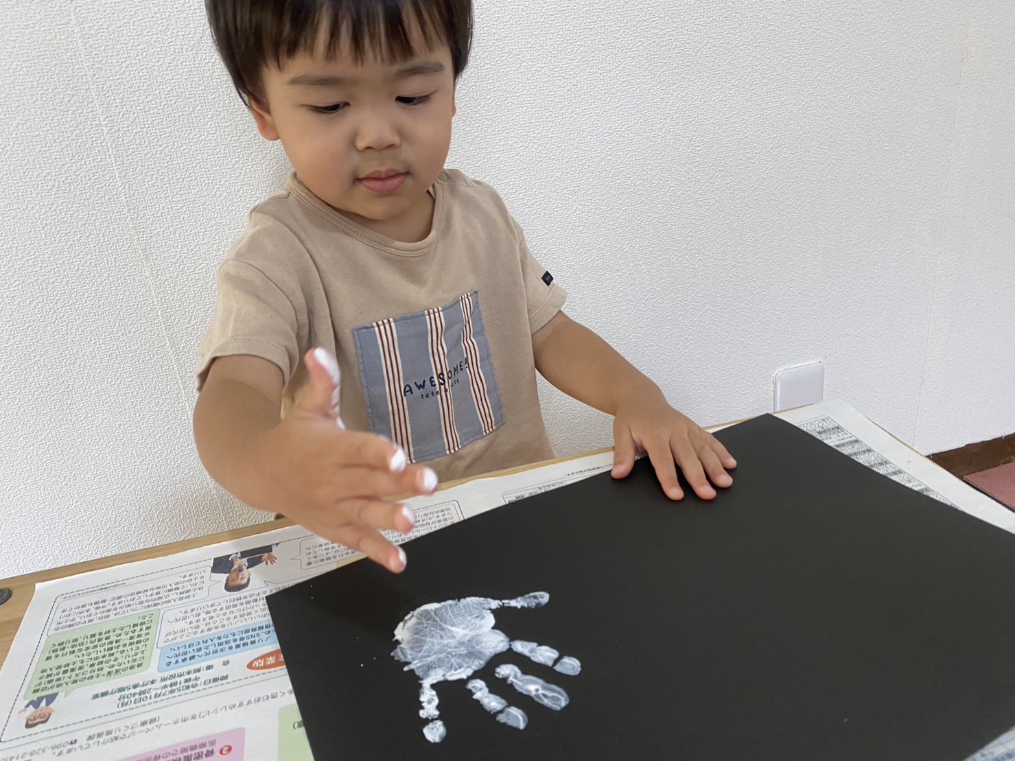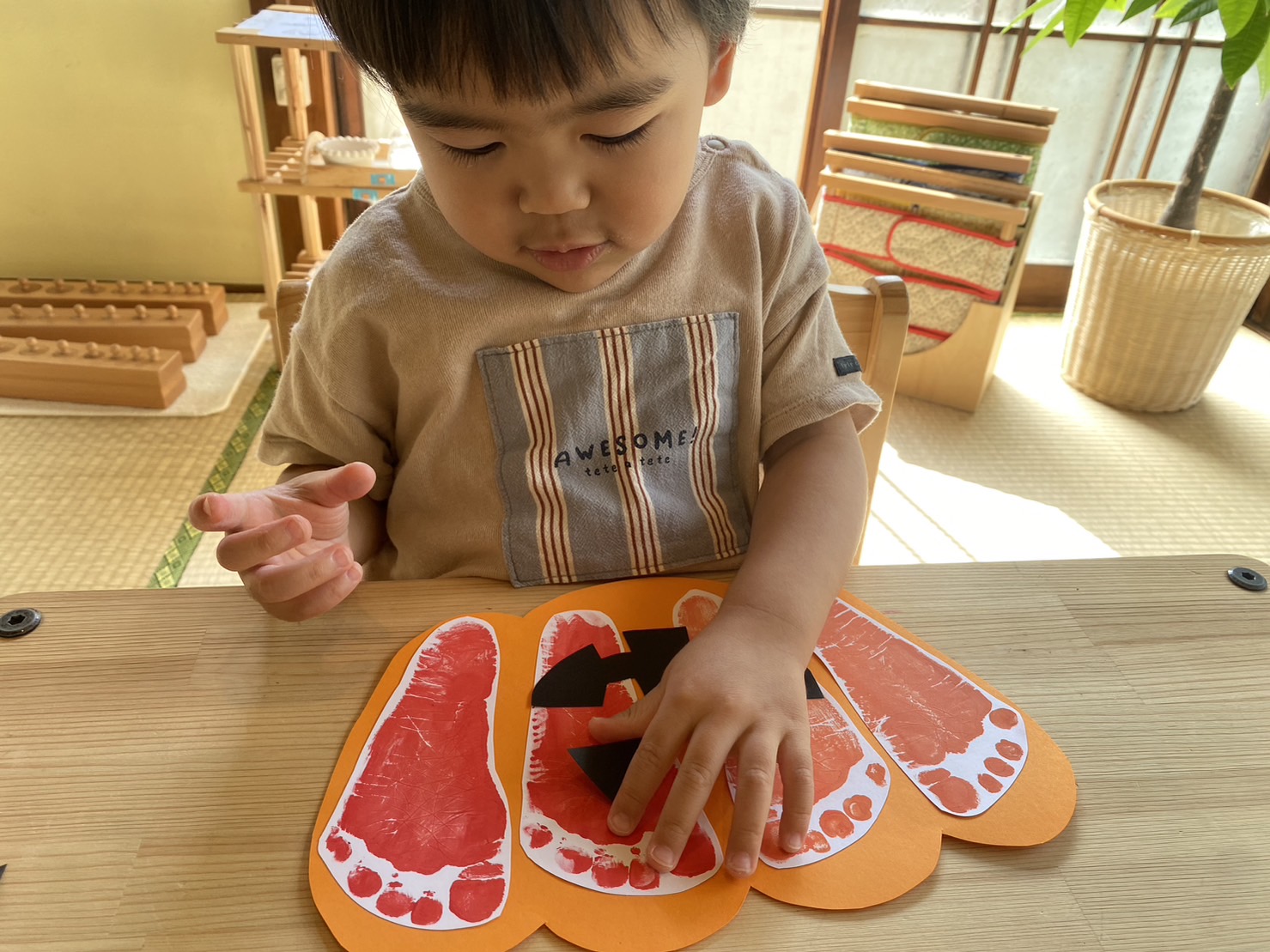今週のえんじぇるクラスは モンテッソーリ活動、ハロウィン制作、お散歩をしました♪ 手の平、足の平に絵の具を塗ると『きゃははっ!』とくすぐったそうな1歳児さん(´ー`) ぺったん!と画用紙に自分の手形がつくと『てだ~!!』と嬉しそう♪ 軒下で乾かすと、何回も見に行っていましたよ。 手形おばけと足形カボチャに目と口と鼻をつけ・・・完成! 制作後のお散歩途中に他のおうちに飾ってあったハロウィンカボチャを見つけ『おなじ!!おなじ!!』と発見していました☆彡 実はこの【おなじ!】はモンテッソーリ教育では知性の働きの一つとして、大切なポイントとされています。 ①【同じ(同一性)】が分かる ②比較して順番にする(順序) ③分類する 五感を使ってこの経験をたくさん積むことで《物事を論理的に考える》力が成長していきます( *´艸`) 何気ない子どもたちの言葉にも成長のヒントが隠されていますね♪ また来週も楽しみです♪ 秋の体験会も受付中です! 質問等も【お問い合わせ】フォームからお気軽にご連絡ください(´ー`) 福岡モンテッソーリ教室てんしのおうち 福岡ベビーシッター |