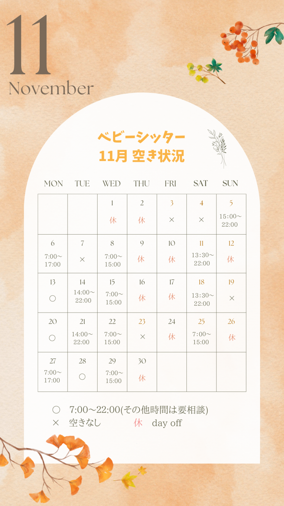 こんにちは!紅葉が楽しみな季節になりました♪ 季節の変わり目、体調を崩さないように過ごしていきたいですね!! それにしても1か月が早すぎる・・・ 年末に向けて一気に駆け抜けたいと思います( *´艸`) ![]() 11月の受付を開始いたします♪ ご予約・お問い合わせは【お問い合わせ】フォームよりお待ちしております! 福岡モンテッソーリ教室てんしのおうち 福岡ベビーシッター |
