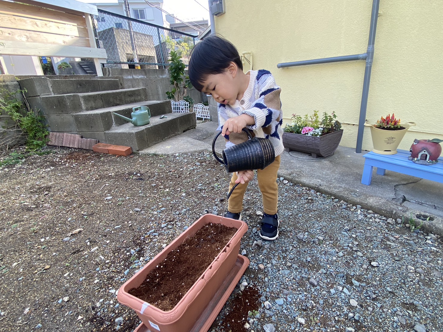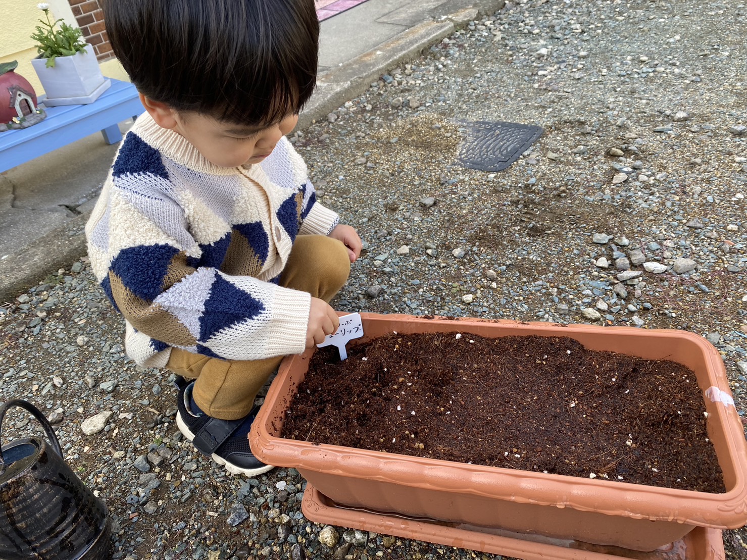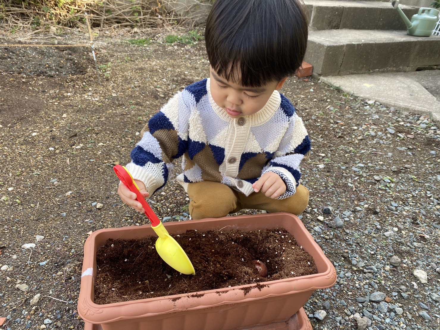 今週のえんじぇるクラスではチューリップを植えました(*^^*) 球根を片手に1つずつもち『おおきい~!ちいさい~!』と比べる姿も☆彡 スコップで穴を掘り、球根を入れ土をかぶせます♪ ![]() ![]() 『おふとんかぶせよ~』と優しい1歳児さん★ その後、お水をあげて完成!! ![]() 春が待ち遠しいですね(´ー`) 何色のチューリップが咲くかな~♪ 一気に冷え込んできたので皆さん風邪をひかないように(@_@) おとな1人にこども2人までの特別な教室♪ 体験会も受け付けておりますのでお気軽にご連絡ください! 福岡モンテッソーリ教室てんしのおうち 福岡ベビーシッター |