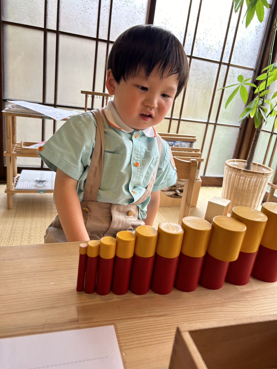 高さと太さの法則性が異なる色付き円柱のおしごとに取り組む年中さん★ それぞれの円柱の秩序性の違いに気付き、比較する中で相互関係を把握する基礎を培うことを目的としているおしごとです♪ 『つぎは、、これかな?』とよく考えながら徐々に細い円柱を並べていきます。 『黄色と赤、ぴったりだよね!』と直径が同じであることも気付いていましたよ(*´ω`) ![]() 時間をかけて並べ終わると、『きれ~!!!』とうっとり♪ 『黄色はだんだん背がちいさくなってるね!!』と観察しながら《違い》の観察を楽しんでいました。 途中並べる順番が違っても、大人が間違いを指摘するのではなく、子ども自身でじっくり観察する中で視覚で『あ!!なんか変!順番が違った!』と気付くことを大切にしています。 【観察】する中で【気付き】が生まれ《思考力》が育まれていきますね♪ ![]() 夏がいよいよ目の前に!今年も暑くなりそうです☆(≧▽≦) 水分補給に休息!!!保護者の方もお身体ご自愛ください♪ 《モンテッソーリレッスン》 おとな1人にこども2人までの特別な教室♪ 1回50分です。 《えんじぇるクラス》 2.5時間の中でモンテッソーリ活動やリトミック、お散歩・公園などの戸外遊びを楽しみます。 《わくわくシッター》 1歳半~/単発3時間~/ちょっとしたお困りの際にお預かりいたします。ご自宅、公園、商業施設などご希望に沿ってサポートいたします。 福岡モンテッソーリ教室てんしのおうち 福岡ベビーシッター |