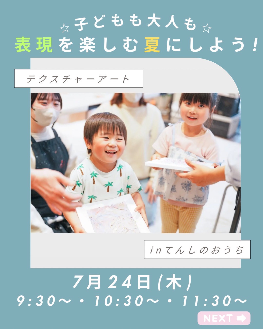 バスハイクに続き、夏休みイベント第二弾!! テクスチャーアートのワークショップを開催していただきます★ ![]() ![]() 数ヶ月前、個人的に気になって蔦屋さんで開催されていたワークショップに参加したところ『これはぜひみんなに体験して欲しい!!』と思い、BLOSSOMIX.ACADEMYの梅野先生にお声掛けさせていただきました☺️ そしてなんと!!今回タイミングが合って、てんしのおうちに来ていただけることに!!! 急なお知らせですが、みなさんぜひ不思議で面白い、大人も夢中になれる体験をしに遊びに来てください♪ 子どもはもちろん、ぜひ保護者の方たちにも体験してほしいアートです ⭐︎⭐︎⭐︎ テクスチャーアートとは? 筆や手を使って、自由に色や形、質感を表現するアートです。失敗を恐れず、自分の感情やインスピレーションを作品に込められるのが魅力! 「どんな色が混ざるかな?」「どんな形ができるかな?」一緒に発見を楽しみましょう♥ 対象年齢:0歳以上のお子さまから大人の方まで! 親子でのご参加も大歓迎です。 【参加費】 Sサイズ2750円 Mサイズ 3300円 Lサイズ3850円 丸キャンバス 4400円(材料費込み) 【キャンバスサイズ】 ●S(約15×15cm):気軽に描ける手のひらサイズ ●M(約20×20cm):ちょうどいい人気サイズ ●L(約33×24cm):のびのび描ける大きめサイズ ●丸キャンバス(直径約20cm):ユニークな円形 ※全面希望もできます(+550円) 【作成時間】 30-45分 【ご参加の際のお願い】 ・絵の具を使いますので、汚れてもいい服装でお越しください。 ・必要な方はスモッグやエプロンをお持ちください。 ・熱中症対策のため、飲み物をご持参ください。 【駐車場について】 公共交通機関または、近隣パーキングをご利用ください。 【申込方法】 希望の時間帯・参加人数(作る数)を申し込みフォームにて教えてください。 ご参加お待ちしております 質問などもお気軽にどうぞ!! 《モンテッソーリレッスン》 おとな1人にこども2人までの特別な教室♪ 50分/月3回 《えんじぇるクラス》 モンテッソーリ教育の活動やリトミック、お散歩・公園などの戸外遊びを楽しみます。 2.5時間/月3回 《親子教室》 親子で通っていただくクラス。モンテレッスンの他にふれあい遊びや座学、製作なども♪ 40分/月2回 《わくわくシッター》 1歳半~/単発3時間~/ちょっとしたお困りの際にお預かりいたします。ご自宅、公園、商業施設などご希望に沿ってサポートいたします。 福岡モンテッソーリ教室てんしのおうち 福岡ベビーシッター 福岡モンテッソーリ教育 |