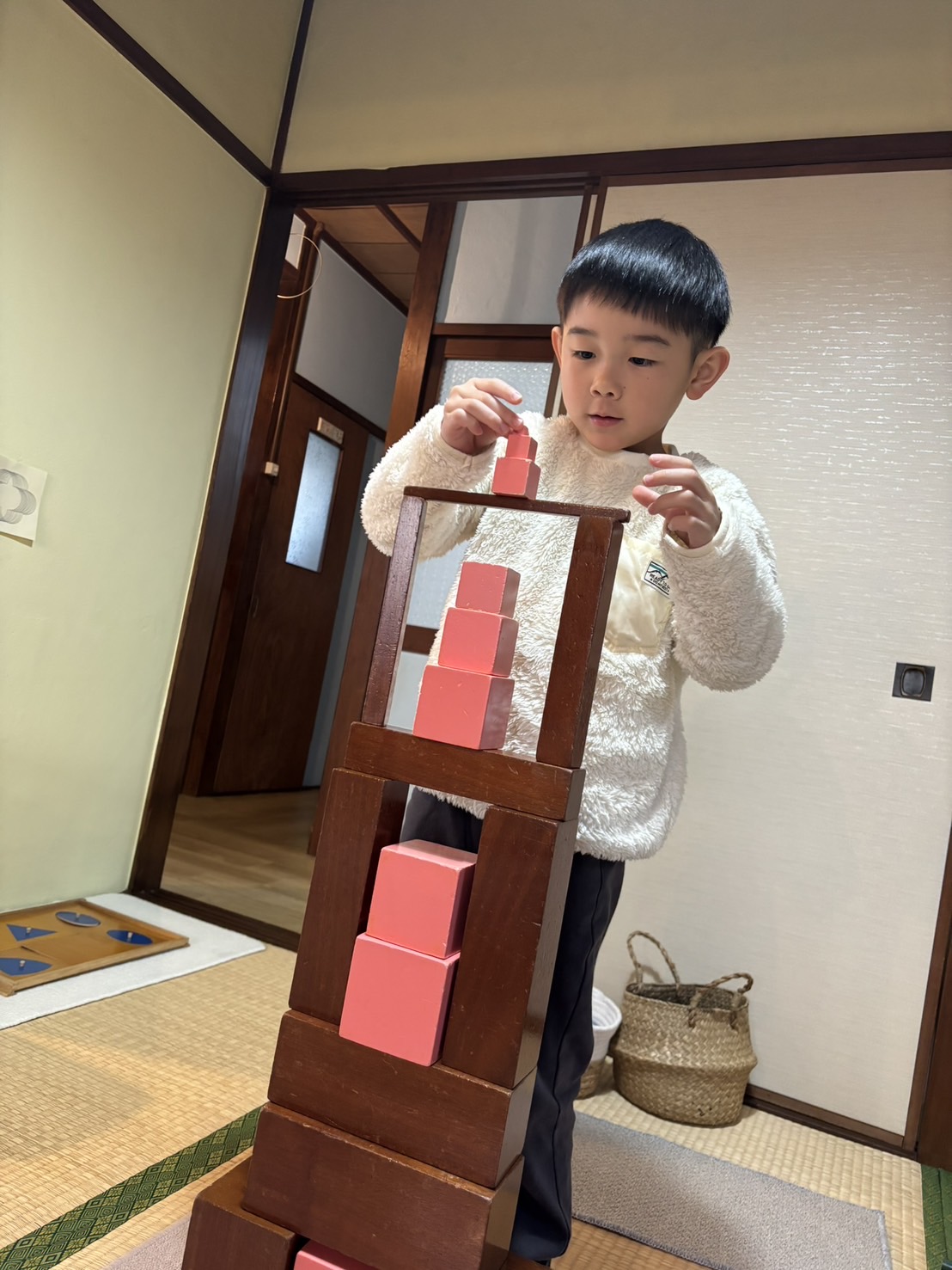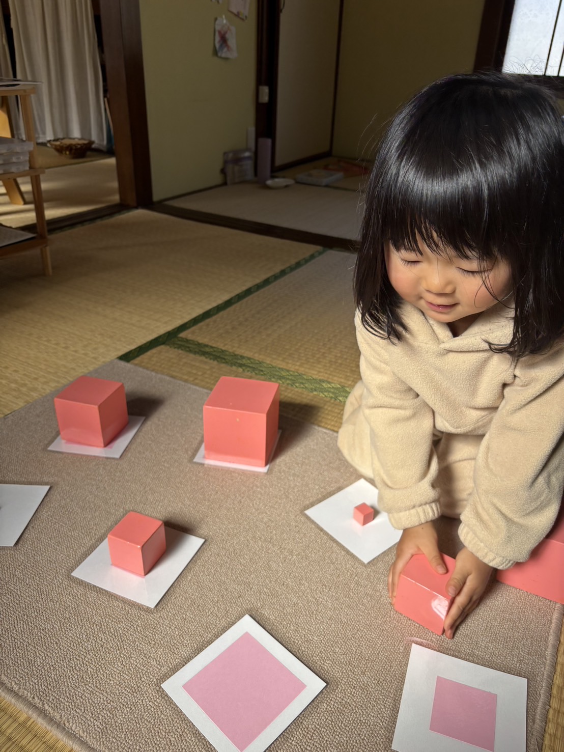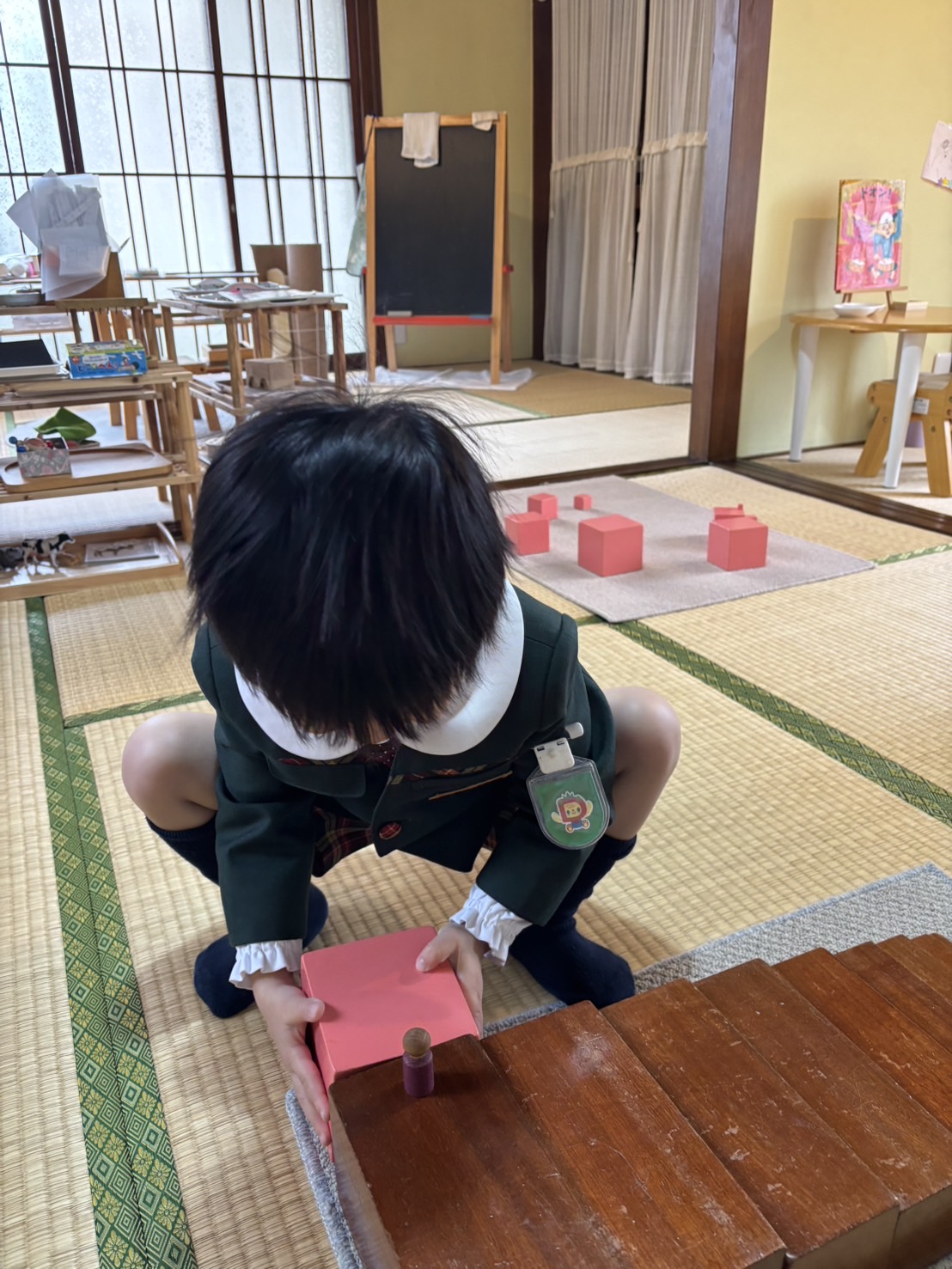 今日はピンクタワーのご紹介♪ モンテッソーリ教具といえばこれ!という位目にする方も多いのではないでしょうか(´ー`) ピンクタワーはモンテッソーリ5領域(日常生活・感覚・言語・数・文化)の中の感覚に属する教具です。 ![]() 視覚で立方体の大きさと漸次性(少しずつ順を追って変わっていく様子)を識別する事が直接的な目的としています。 また活動に取り組む中で、下記の力も自然と育んでいきます♪ ①数学的思考の育成 ②手と腕の筋肉運動の調整 ③観察力・注意力・集中力の育成 ④美的感覚の目覚め ![]() ![]() ![]() 小さいものは1センチの立方体、大きいものは10センチの立方体、手に取りながら『おもいっ!』と重さも感じながら積んでいきます。 1センチはとても軽くコロッと落ちてしまうので集中力が試されます(*^^*) 次はどの立体を積むか分からないな~というお子さんには2個選んで『どっちが大きい?』『どっちが小さい?』と二択の中から比較して考えてもらっていますよ♪ 全て積みあがって『きれ~』とうっとりする子も。 ![]() ![]() 展開では、面の一致をしたり、一段ずつどのくらい差があるか測ったり、図を見ながら組み立てたりと盛りだくさん!! 小さい子から大きい子まで楽しめる素敵な教具です(≧▽≦) ![]() ![]() 《モンテッソーリレッスン》 おとな1人にこども2人までの特別な教室♪ 50分/月3回 《えんじぇるクラス》 モンテッソーリ教育の活動やリトミック、お散歩・公園などの戸外遊びを楽しみます。 2.5時間/月3回 《親子教室》 親子で通っていただくクラス。モンテレッスンの他にふれあい遊びや座学、製作なども♪ 40分/月2回 《わくわくシッター》 1歳半~/単発3時間~/ちょっとしたお困りの際にお預かりいたします。ご自宅、公園、商業施設などご希望に沿ってサポートいたします。 福岡モンテッソーリ教室てんしのおうち 福岡ベビーシッター 福岡モンテッソーリ教育 |