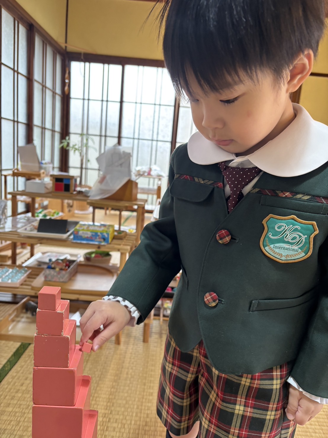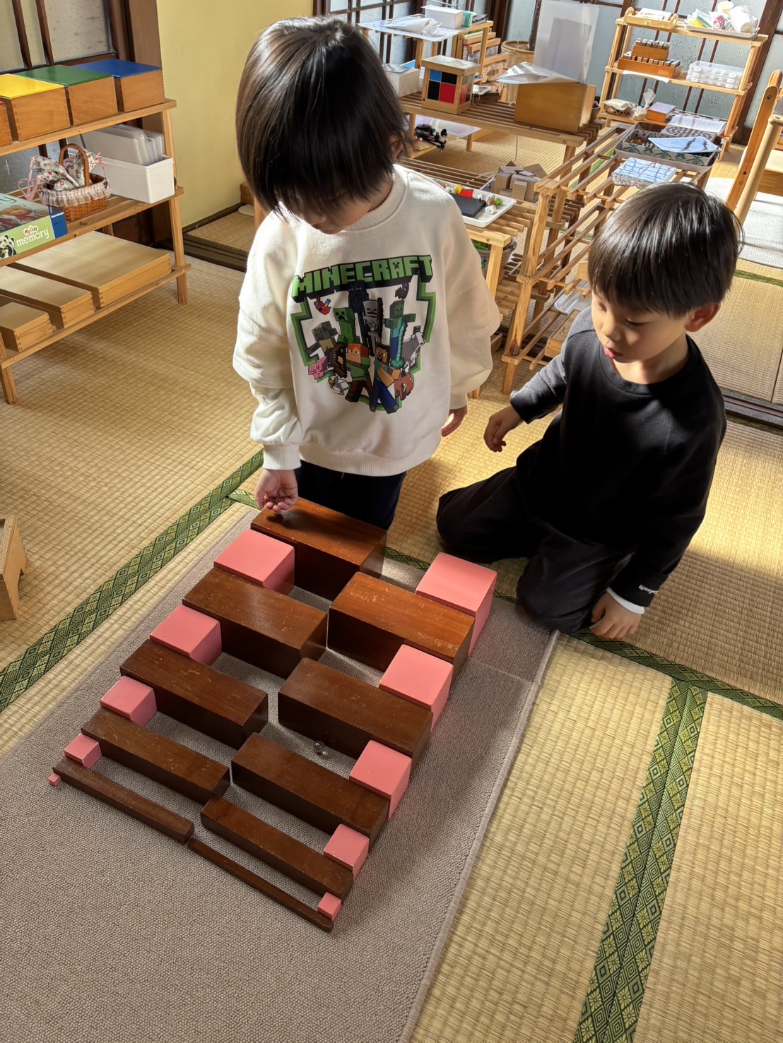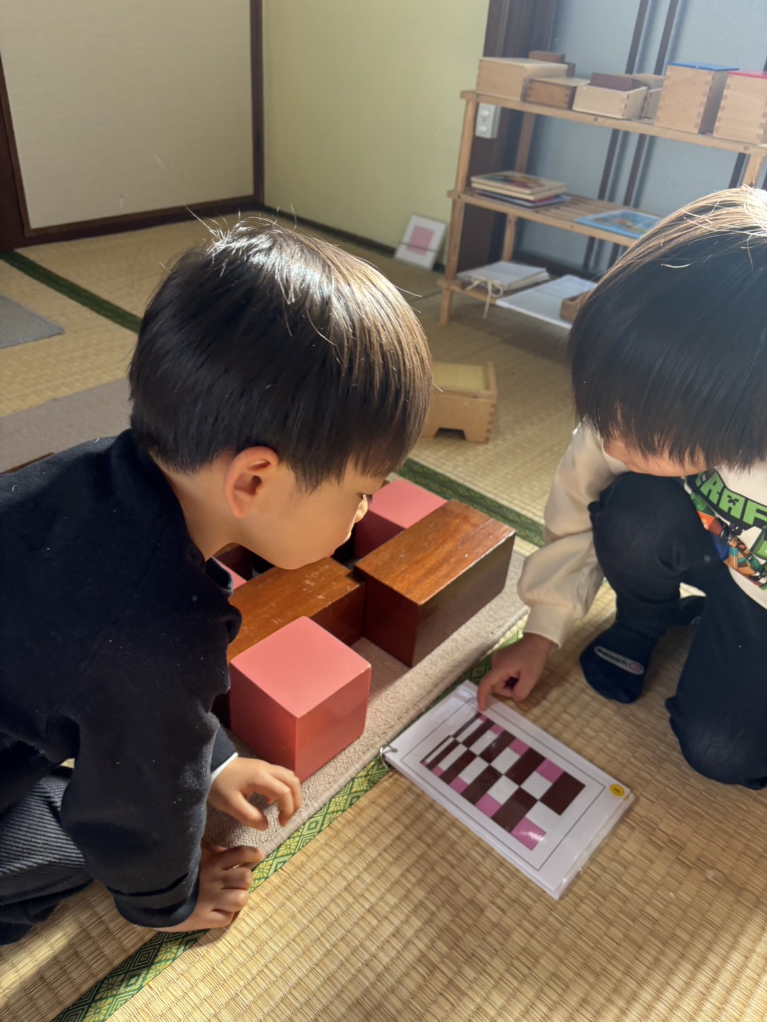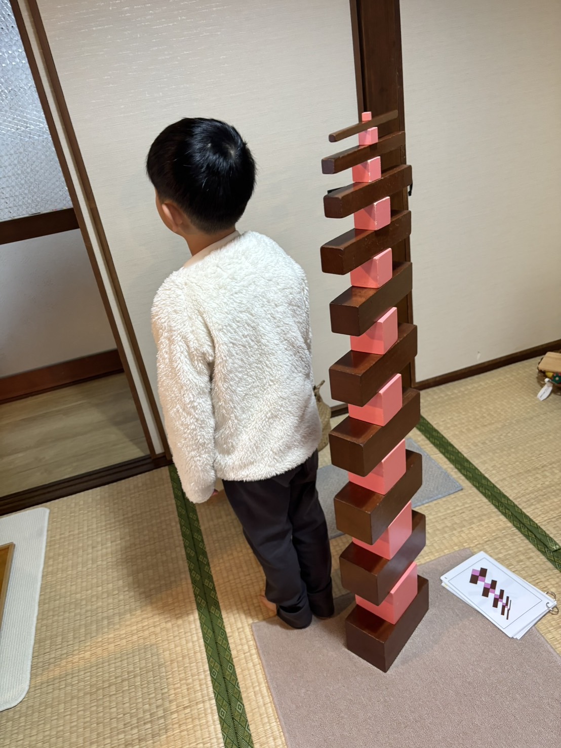今日はピンクタワーのご紹介♪ モンテッソーリ教具といえばこれ!という位目にする方も多いのではないでしょうか(´ー`) ピンクタワーはモンテッソーリ5領域(日常生活・感覚・言語・数・文化)の中の感覚に属する教具です。 ![]() 視覚で立方体の大きさと漸次性(少しずつ順を追って変わっていく様子)を識別する事が直接的な目的としています。 また活動に取り組む中で、下記の力も自然と育んでいきます♪ ①数学的思考の育成 ②手と腕の筋肉運動の調整 ③観察力・注意力・集中力の育成 ④美的感覚の目覚め ![]() ![]() ![]() 小さいものは1センチの立方体、大きいものは10センチの立方体、手に取りながら『おもいっ!』と重さも感じながら積んでいきます。 1センチはとても軽くコロッと落ちてしまうので集中力が試されます(*^^*) 次はどの立体を積むか分からないな~というお子さんには2個選んで『どっちが大きい?』『どっちが小さい?』と二択の中から比較して考えてもらっていますよ♪ 全て積みあがって『きれ~』とうっとりする子も。 ![]() ![]() 展開では、面の一致をしたり、一段ずつどのくらい差があるか測ったり、図を見ながら組み立てたりと盛りだくさん!! 小さい子から大きい子まで楽しめる素敵な教具です(≧▽≦) ![]() ![]() 《モンテッソーリレッスン》 おとな1人にこども2人までの特別な教室♪ 50分/月3回 《えんじぇるクラス》 モンテッソーリ教育の活動やリトミック、お散歩・公園などの戸外遊びを楽しみます。 2.5時間/月3回 《親子教室》 親子で通っていただくクラス。モンテレッスンの他にふれあい遊びや座学、製作なども♪ 40分/月2回 《わくわくシッター》 1歳半~/単発3時間~/ちょっとしたお困りの際にお預かりいたします。ご自宅、公園、商業施設などご希望に沿ってサポートいたします。 福岡モンテッソーリ教室てんしのおうち 福岡ベビーシッター 福岡モンテッソーリ教育 |